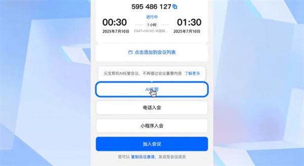 无缝跟尾会议议题。会中也支撑一键AI托管,完整记实每一分钟的内容。用户只需正在会邀页面或是会议列表点击“AI托管”,元宝将正在你临时分开时继续苦守岗亭,或是针对性浏览细致的会议内容。会后还可将记实的AI纪要一键导入元宝拓展发问。点击“AI托管”!